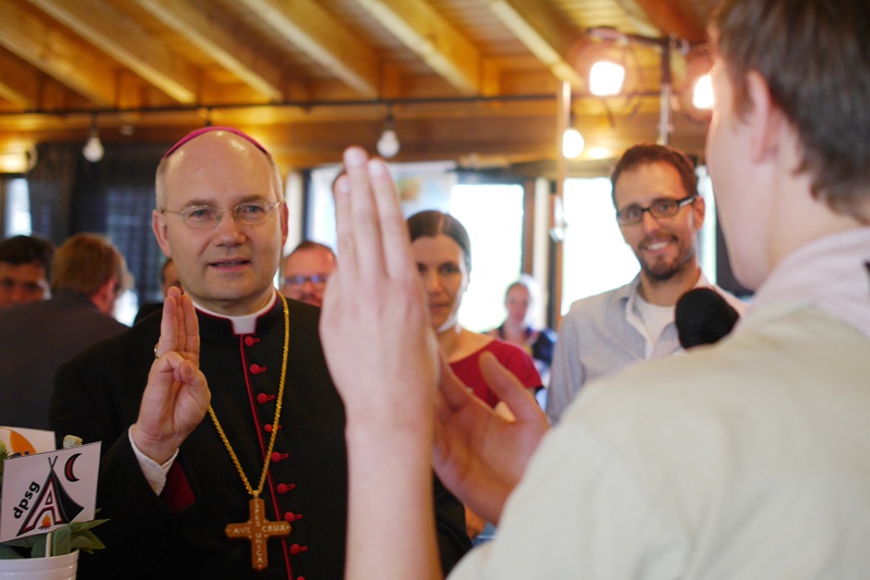 Neben der Verabschiedung von Gesa Zollinger und der Wahl ihrer Nachfolgerin Lioba Jordan standen aber noch zahlreiche weitere Höhepunkte auf dem Programm. Besonders wichtig war den katholischen Jugendverbänden, den Besuch von Bischof Dr. Dieser am Sonntag zum gegenseitigen Kennenlernen zu nutzen. Nachdem der BDKJ-Vorstand bereits im Vorhinein ein ausführliches und anregendes Gespräch mit dem Bischof hatte, gab es nun die Gelegenheit, die elf Mitgliedsverbände und acht Regionalverbände des BDKJ, mit all ihren Unterschieden und Gemeinsamkeiten, persönlich vorzustellen. Der Bischof nahm sich Zeit für viele Gespräche, hakte interessiert nach und konnte zahlreiche Eindrücke und neue Kontakte mitnehmen. Neu in der Runde war auch die Malteser Jugend, die an diesem Wochenende als elfter Mitgliedsverband in den Kreis des BDKJ aufgenommen wurde. Als Erinnerung überreichten die Gruppen dem Bischof einen „Verbandskasten“, einen Koffer voll mit Erinnerungsstücken an die einzelnen Verbände. So schenkten ihm beispielsweise die Jugendverbände der Gemeinschaft Christlichen Lebens (J-GCL) einen Pinsel aus der Bleiberger Fabrik, der ihn an die von der J-GCL organisierten Werkwochen erinnern soll. Die Kolpingjugend brachte Honig der eigenen Bienen mit und die Katholische junge Gemeinde (KjG) überreichte, vor dem Hintergrund des eigenen Freiwilligendienstes im Partnerland des Bistums, ein Kolumbien-Trikot — natürlich bedruckt mit dem Logo des Verbandes und dem Namenszug des Bischofs.